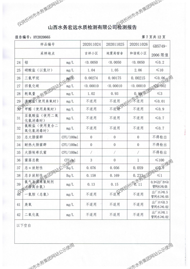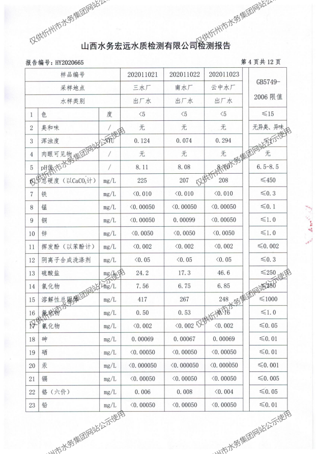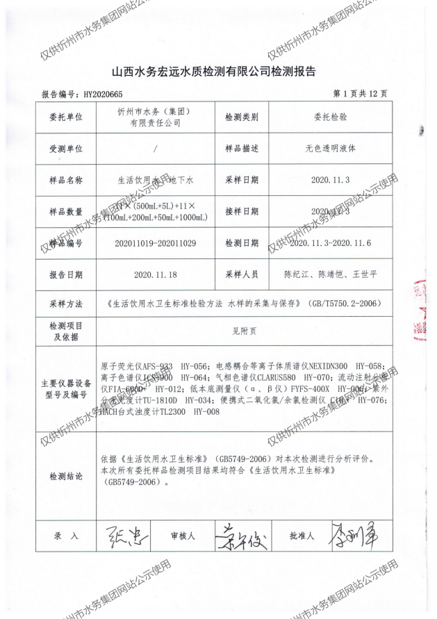 忻州城區(qū)公共供水水源水、出廠水、管網水、管網末梢水2020年11月份水質信息公示
