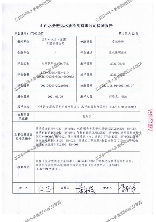 忻州城區公共供水水源水、出廠水、管網水、管網末梢水2021年6月份水質信息公示