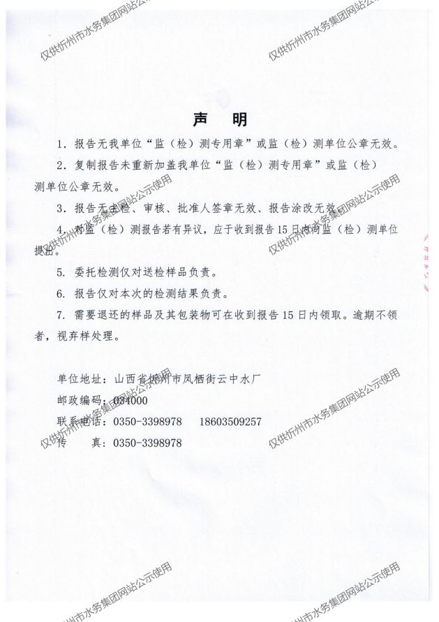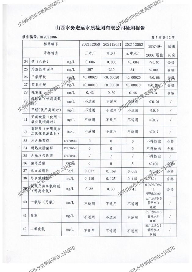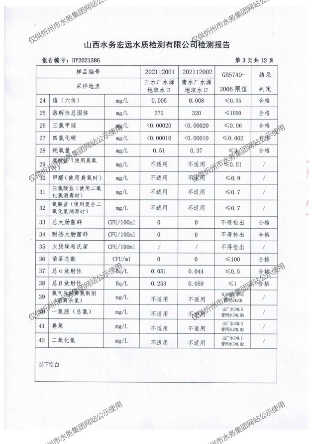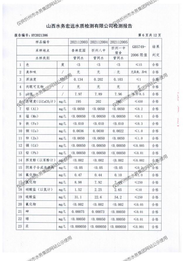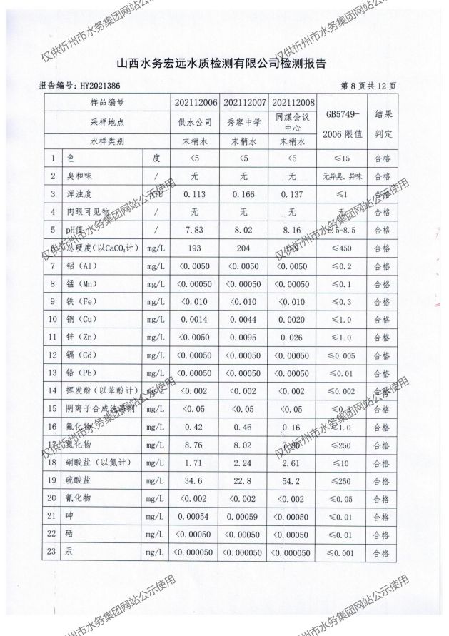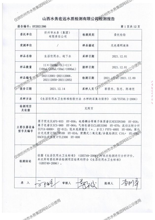 忻州城區(qū)公共供水水源水、出廠水、管網水、管網末梢水2021年12月份水質信息公示