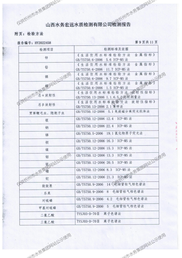 2022年忻州城區公共供水南水廠、三水廠、云中水廠出廠水106項水質全分析