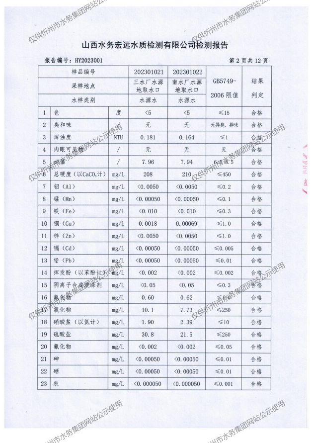 忻州城區公共供水水源水、出廠水、管網水、管網末梢水2023年1月份水質信息公示