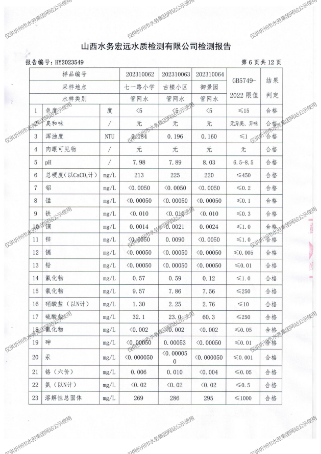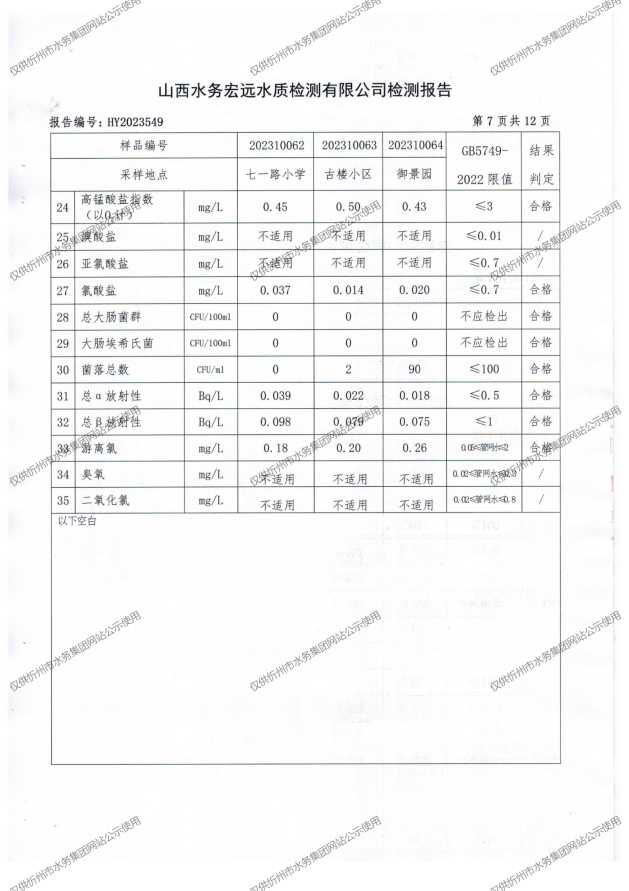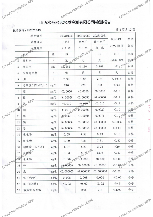 忻州城區公共供水水源水、出廠水、管網水、管網末梢水2023年10月份水質信息公示
