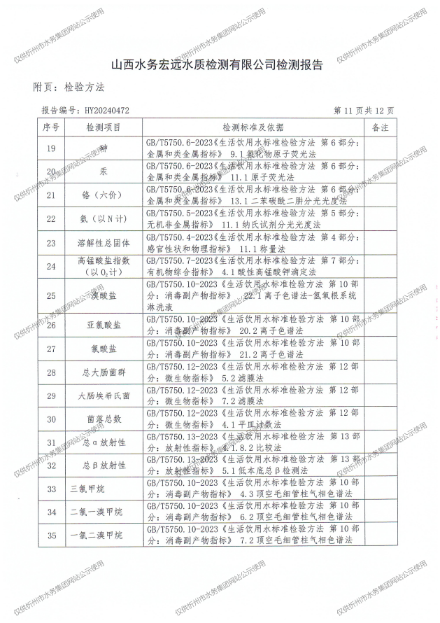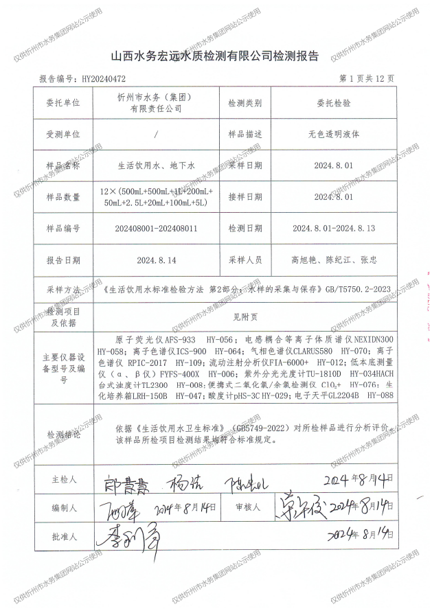 忻州城區公共供水水源水、出廠水、管網水、管網末梢水2024年8月份水質信息公示